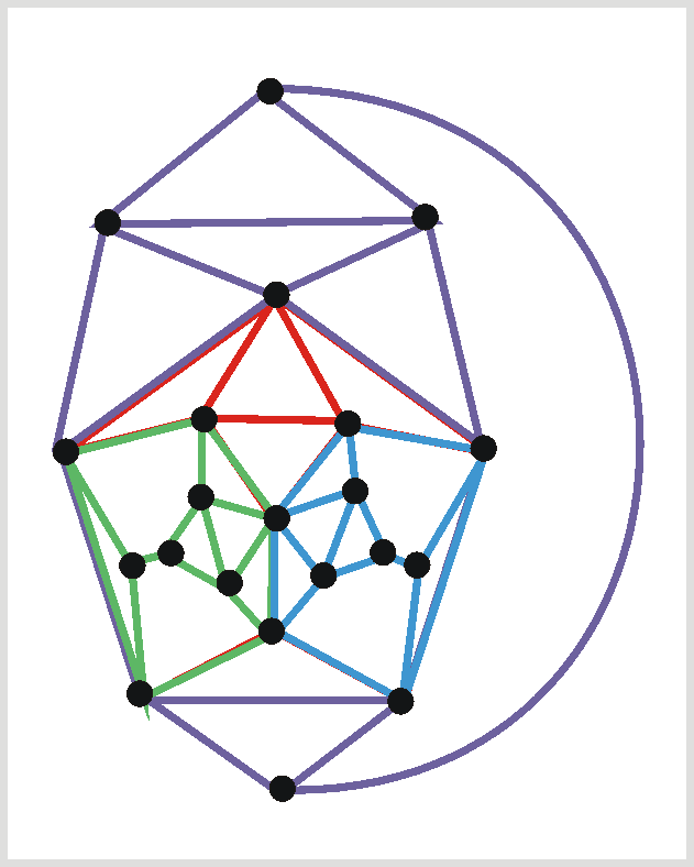 For the glueing, we start with a good plane projection of the first polyhedron, and a good plane projection of the second one where the face to be glued corresponds to the outer region. These second projection is taken, and put inside the region of the first projection corresponding to the face to be glued in the first polyhedron. Below, to the left, a doghouse projection (in red) is placed inside one face of the dodecahedron. In the other graph, two doghouses (in green and blue) are glued at adjacent 5-gons of another doghouse (in red). Then the resulting polyhedron is glued at another 5-gon of another doghouse.
