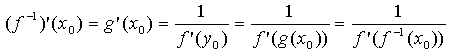 Another way of deriving the formula above is to start with f(f-1(x))=x and differentiate both sides. With the chain rule you get f'(f-1(x))*f-1'(x) = 1, which directly leads to the equation above.