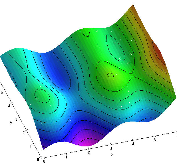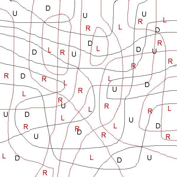 Question 7: A weaker situation: Not fx and fy are given, but just their zero curves. That is, we have two (systems of) curves a (the black ones in the picture to the right) and b (the red ones) in the square [0,6]2. Is there a function f from [0,6]2 to R such that a is the set of all points (x,y) with fx(x,y)=0, and b is the set of all points with gx(x,y)=0? Solution