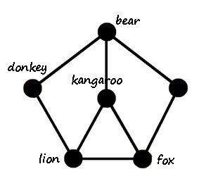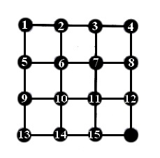 The underlying graph remains fixed, but the distribution of the animals, or the placement of the number squares in the 15 puzzle, changes move by move. Each such distribution is called a state. One cage, or one square, is always empty, so for an underlying graph with n vertices we have n-1 labels---animal names, or numbers--- which are placed at all vertices but one. Examples are shown below.